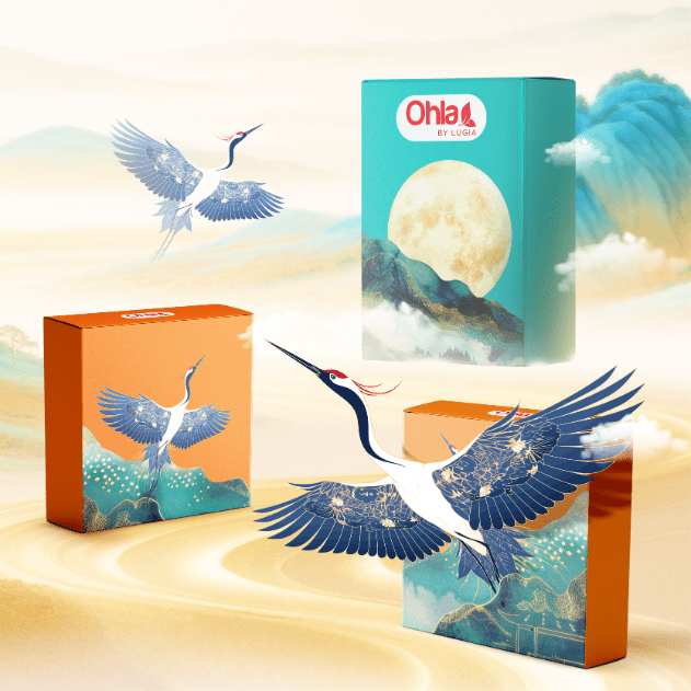 Thiết kế hộp dựa trên tinh thần ấy, kết hợp sắc màu xanh – cam trẻ trung cùng hình ảnh hạc xuân mạnh mẽ vươn mình, gửi gắm lời chúc may mắn – an khang – thịnh vượng cho năm mới. Hiệu ứng phối cảnh trăng sáng, núi non và bầu trời xuân tạo nên một tổng thể sang trọng, tinh tế và đầy chất nghệ thuật.